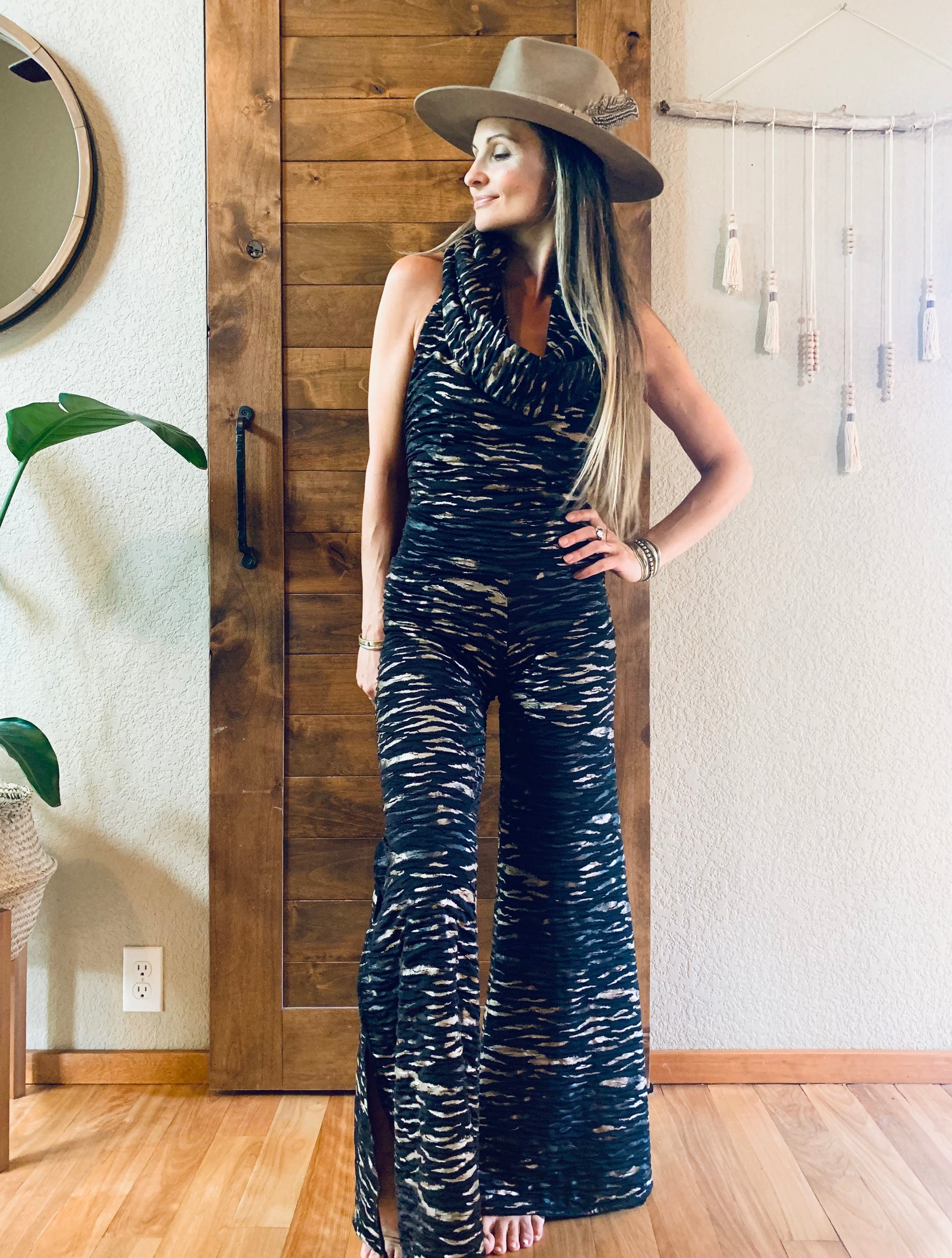 Elevate your wardrobe with our stunning cowl neck onesie in textured black and gold. The elegant cowl neck design effortlessly transforms into a chic hood, adding versatility to your look. With a luxurious four-way stretch, this onesie moves with you, ensuring a flawless fit. The daring slits up the legs not only make a bold fashion statement but also provide added convenience and mobility. Whether you're stepping out for a night on the town or enjoying a casual day out, this onesie is your ultimate go-to for any occasion.