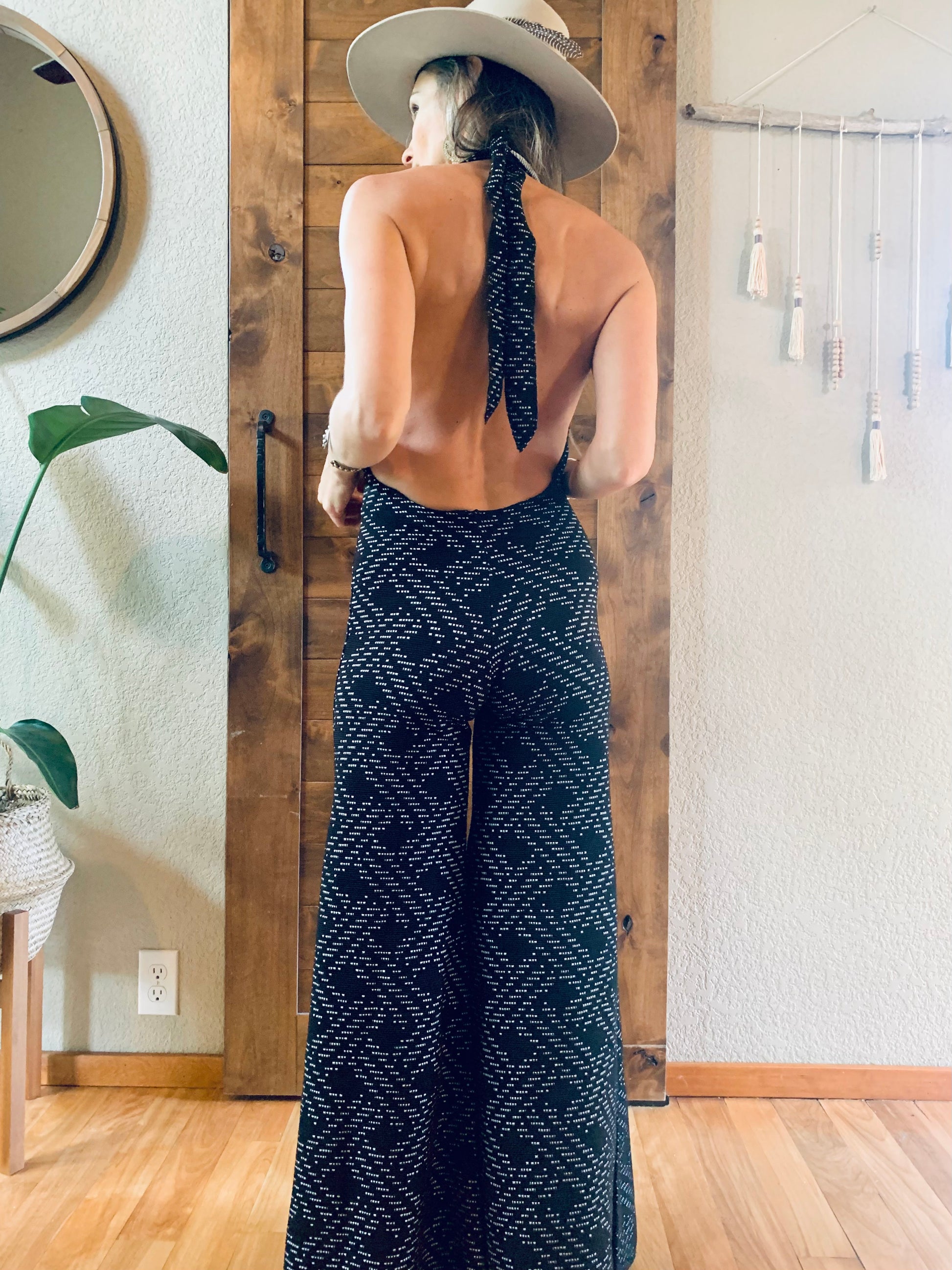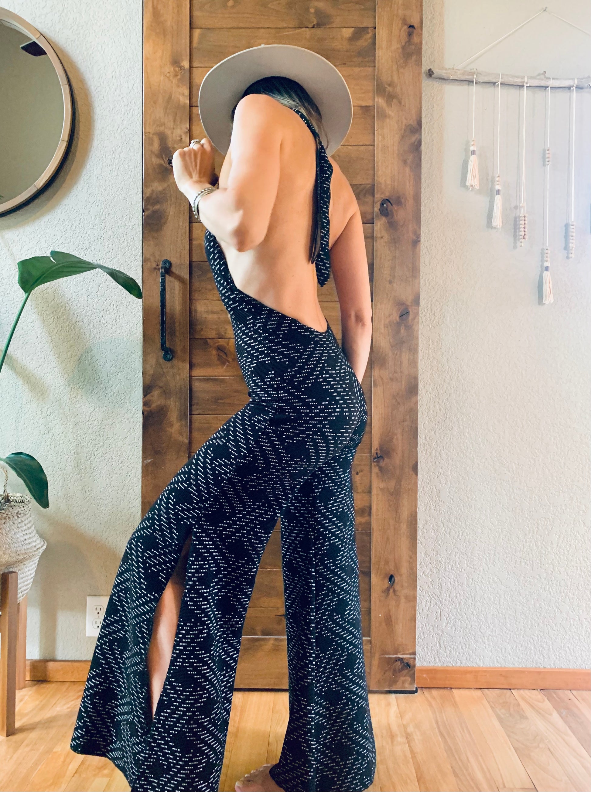 This stylish open back onesie is perfect for any occasion. Dress it up for a night out or pair it with a jacket and boots for a chic, casual look. You can adjust the fit with the easy tie-back around the neck, and the convenient side slit allows for easy bathroom breaks without needing to remove the entire outfit. Made from a four-way stretch fabric for ultimate comfort, this piece is made to dance the night away.