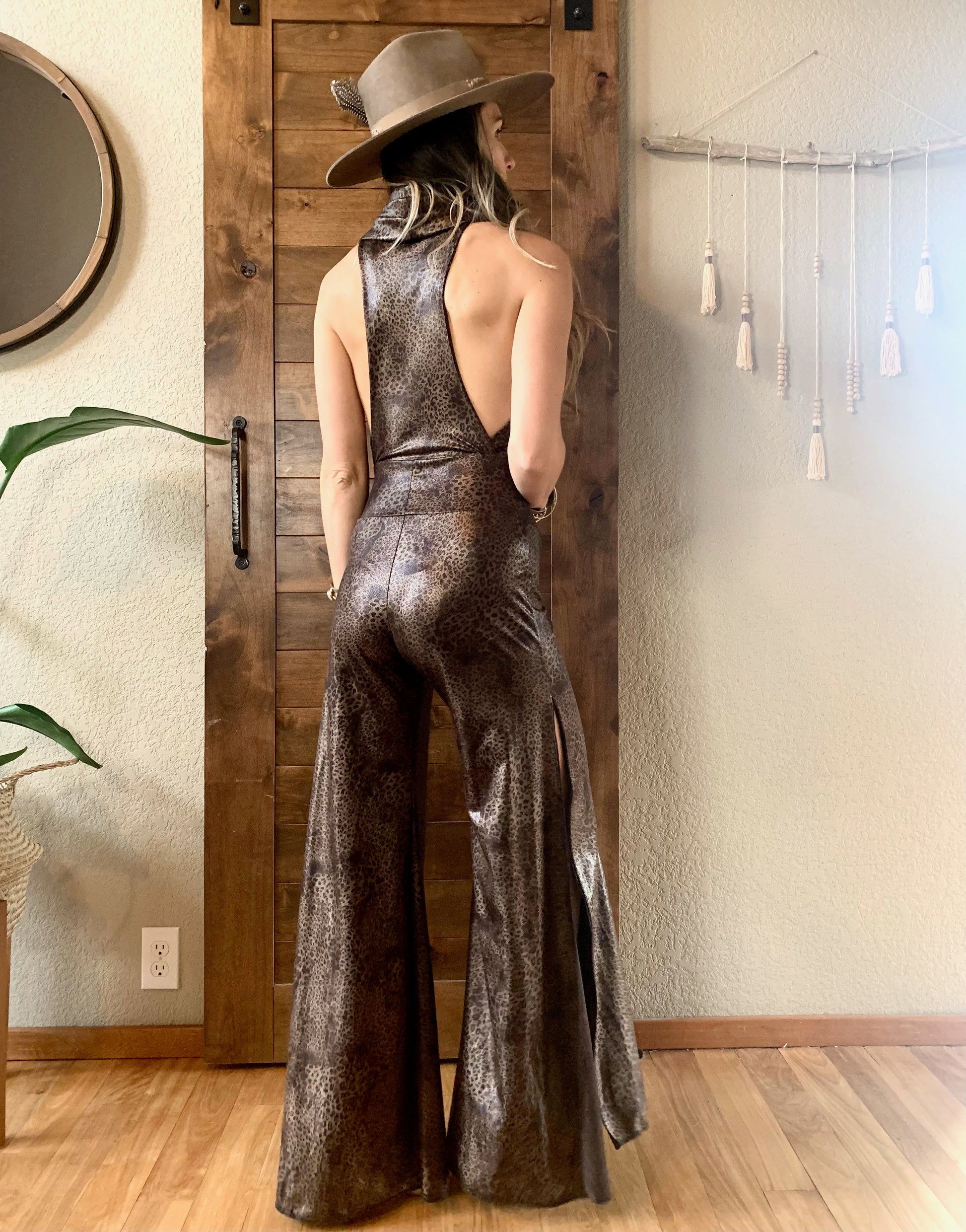 In this stunning cowl neck onesie in a metallic bronze leopard pattern, you can't help but evoke your inner diva. The elegant cowl neck design effortlessly transforms into a chic hood, adding versatility to your look. With a luxurious four-way stretch, this onesie moves with you, ensuring a flawless fit. The daring slits up the legs not only make a bold fashion statement but also provide added convenience and mobility. Feel fabulous in this eye-catching piece!