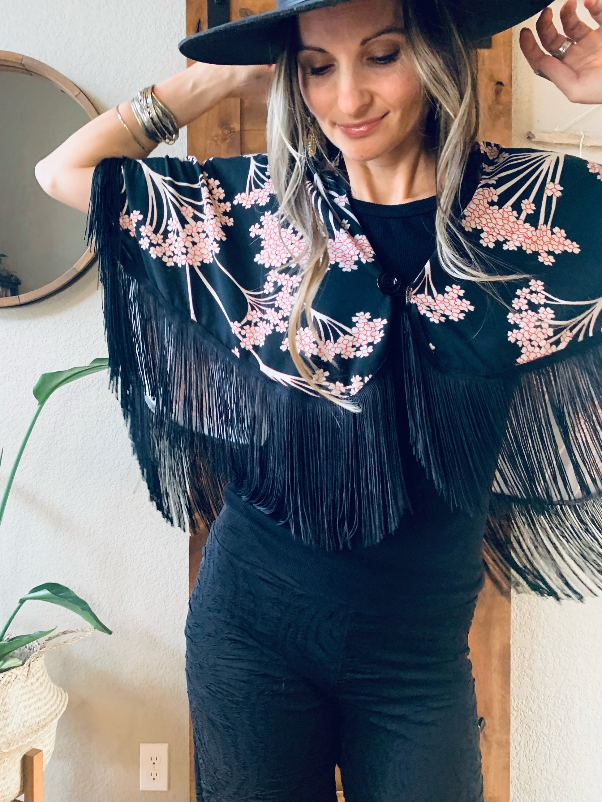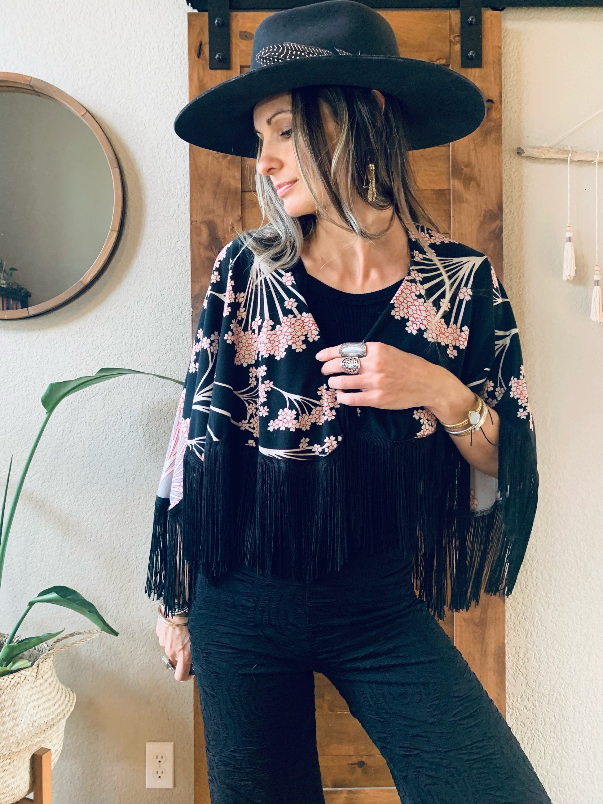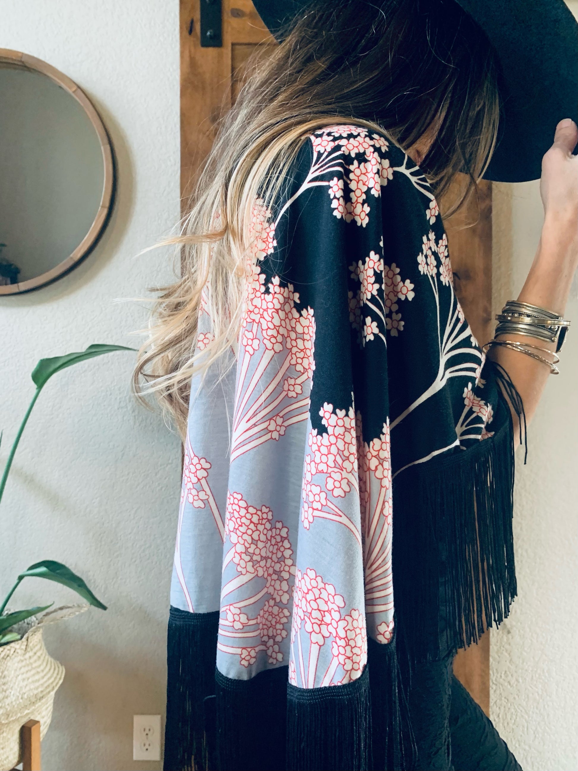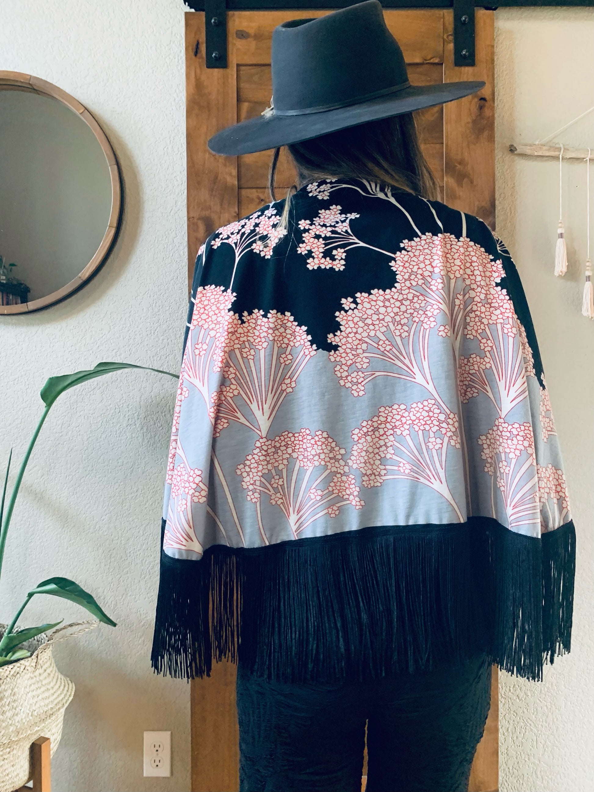 This elegant, fringed shrug is made out of soft material with cheery blossom design, reminiscent of a Japanese garden. Upgrade any outfit with this easy to wear garment.