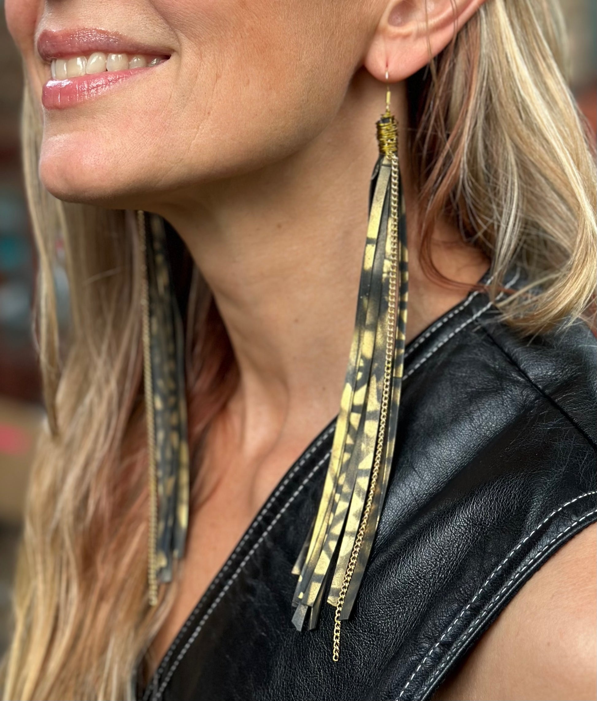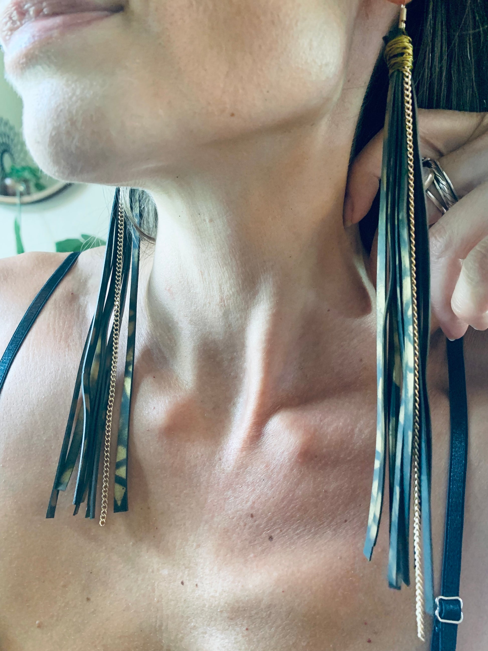 This handmade set of earrings are up-cycled bike inner tubes and are surprisingly lightweight. When you move, the metallic detail will come alive, and add a dramatic flair to any outfit. Available with gold detail & hardware and antiqued silver detail & hardware.