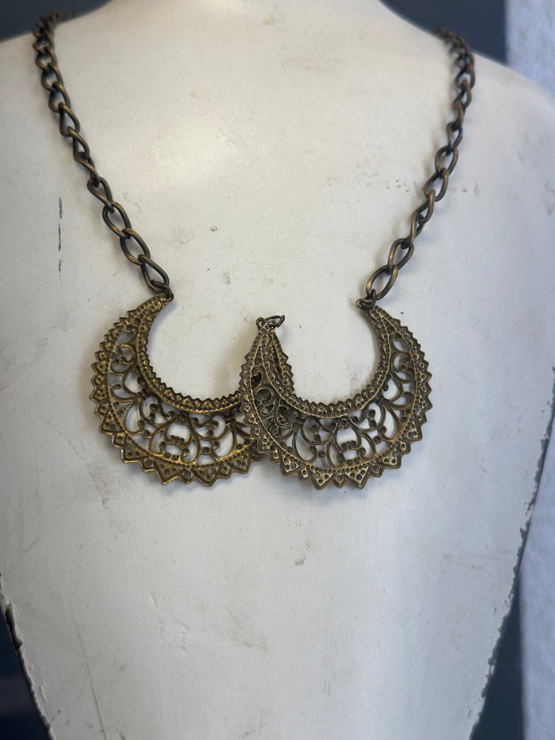 Two moon shaped metal pendants with intricate filigree adorn a bold chain in this beautiful necklace. The color is bronze/antique gold.