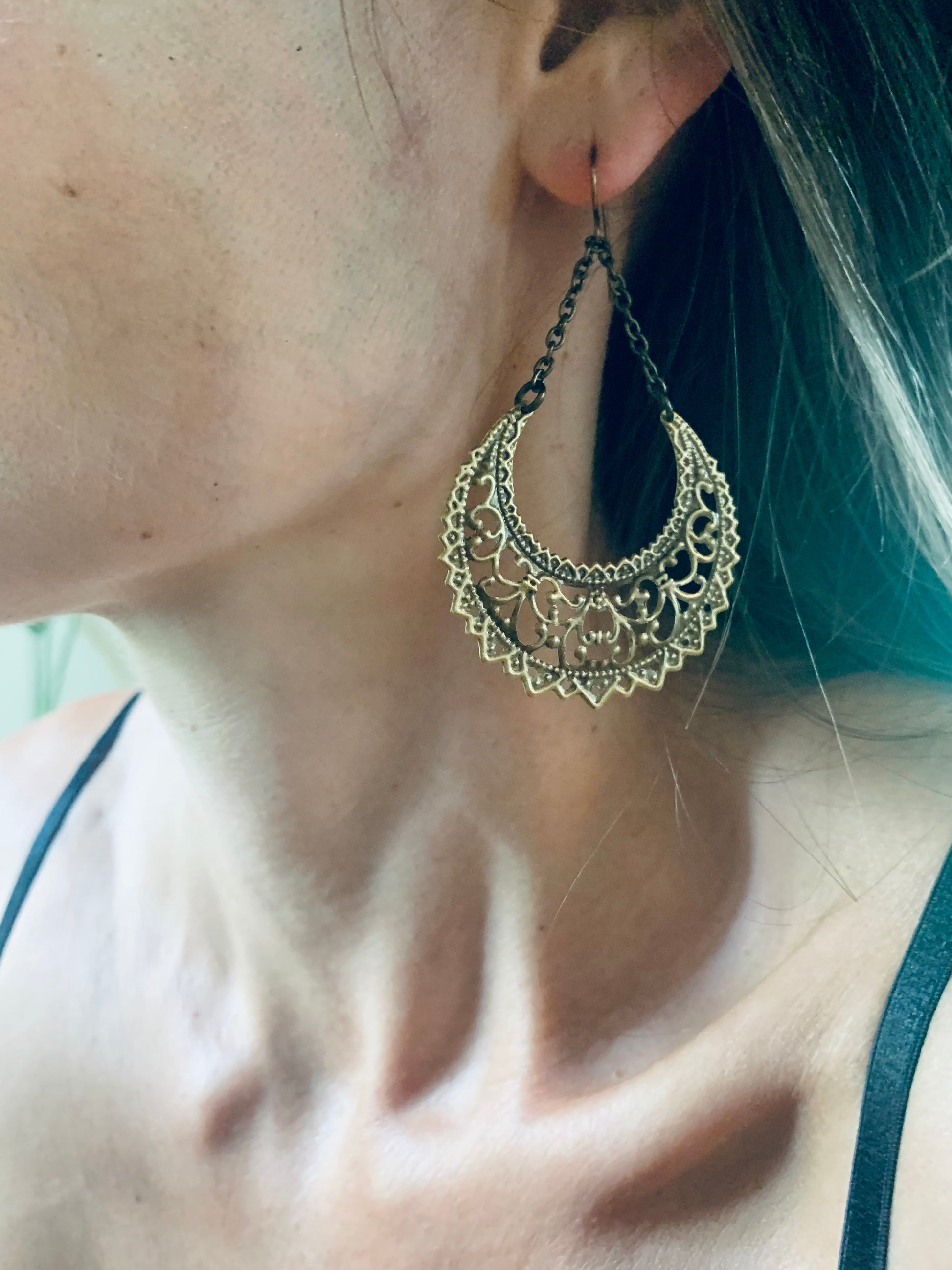 These earrings feature a beautiful moon shaped pendant with filigree detail and chain attachment to create extra movement. The color is antique gold/bronze