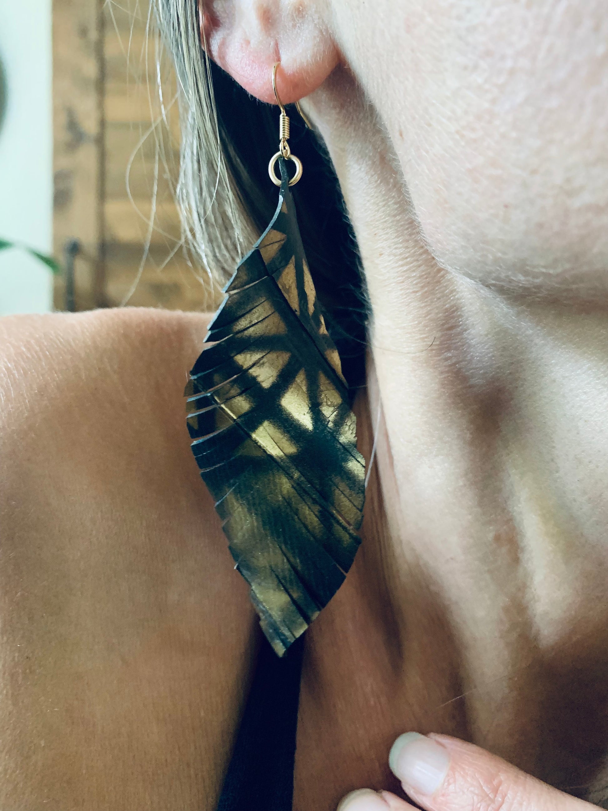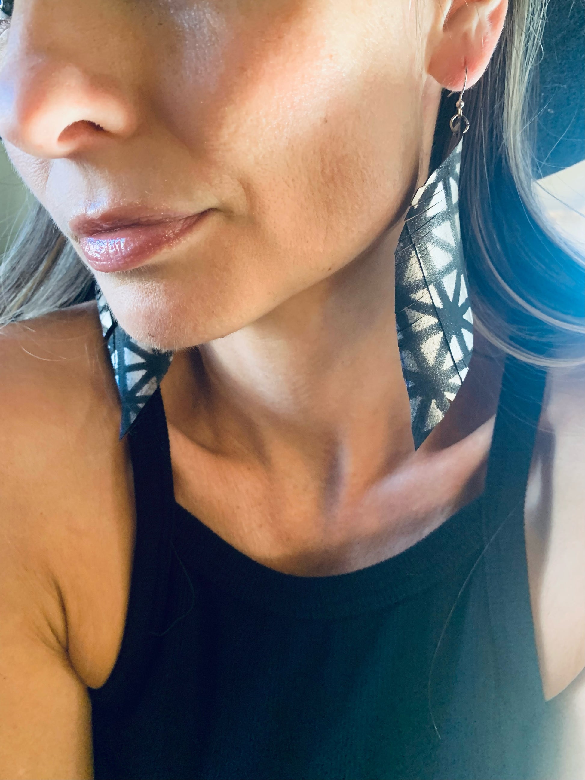 This pair of earrings are made of up-cycled bike inner tubes and feature a fun metallic pattern and a fringe that adds movement into the piece. They are so light, you'll almost forget you're wearing them.