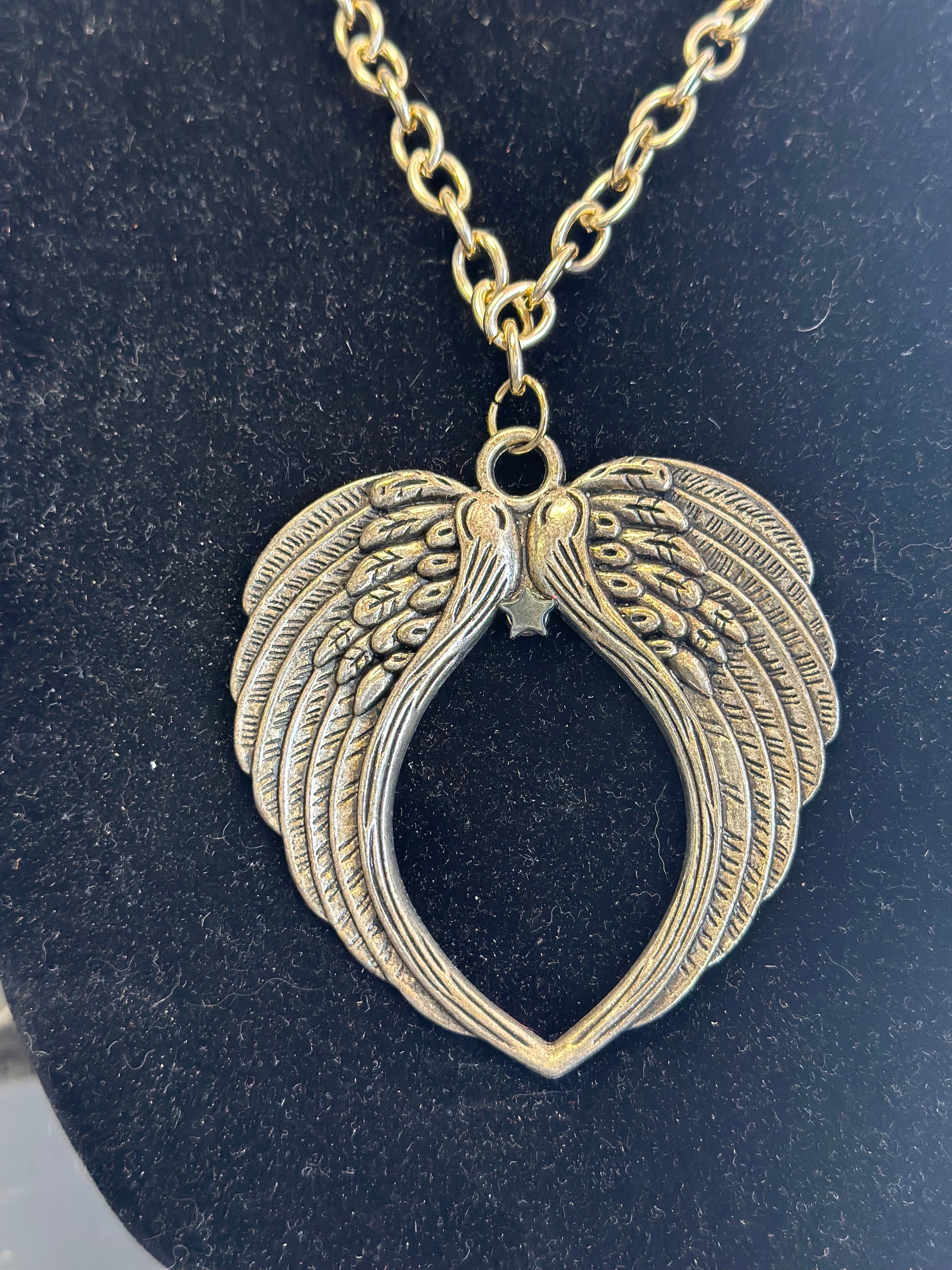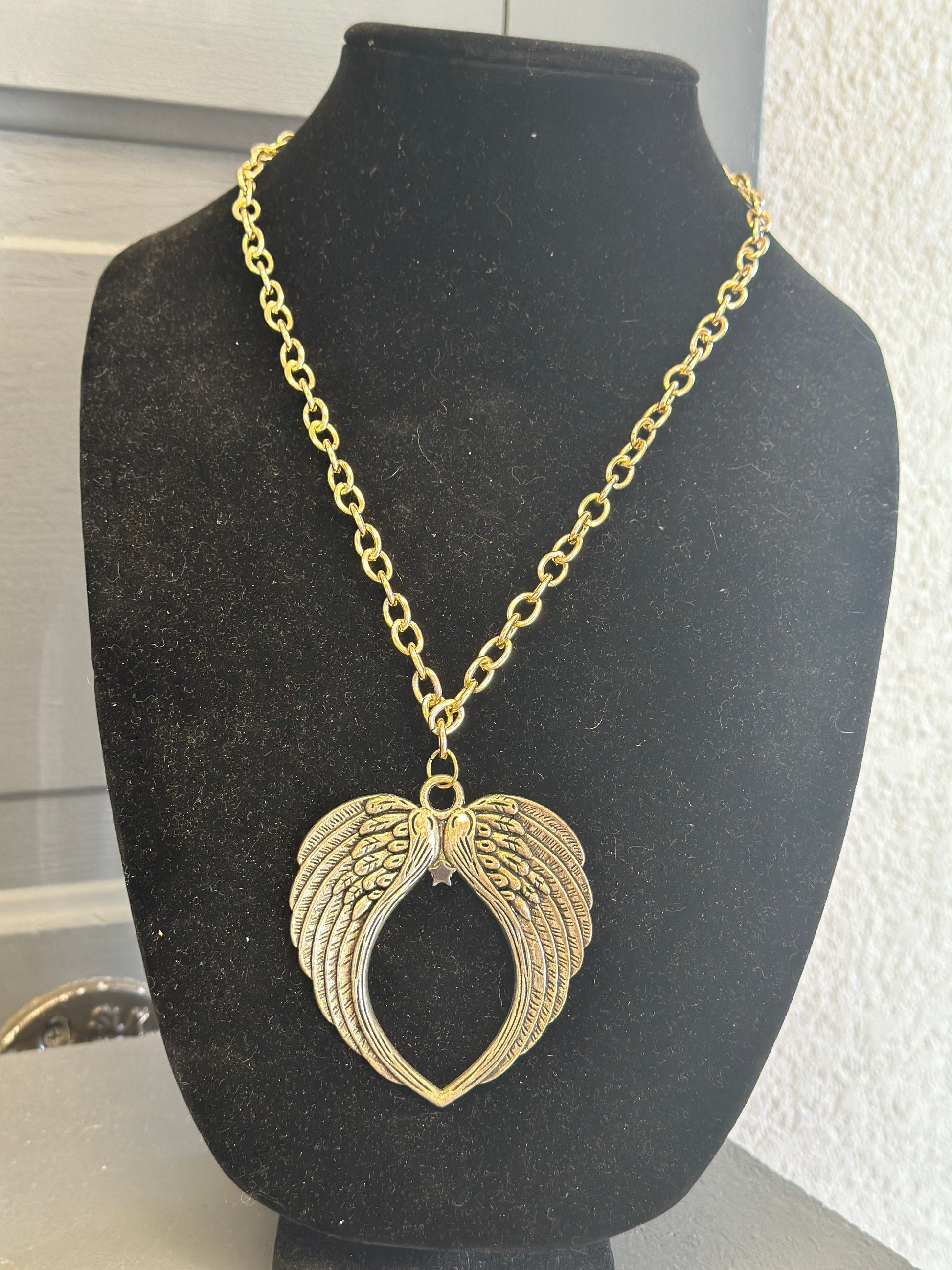An antique gold pendant in the shape of two beautiful wings forming a heart adorns a bold chain.