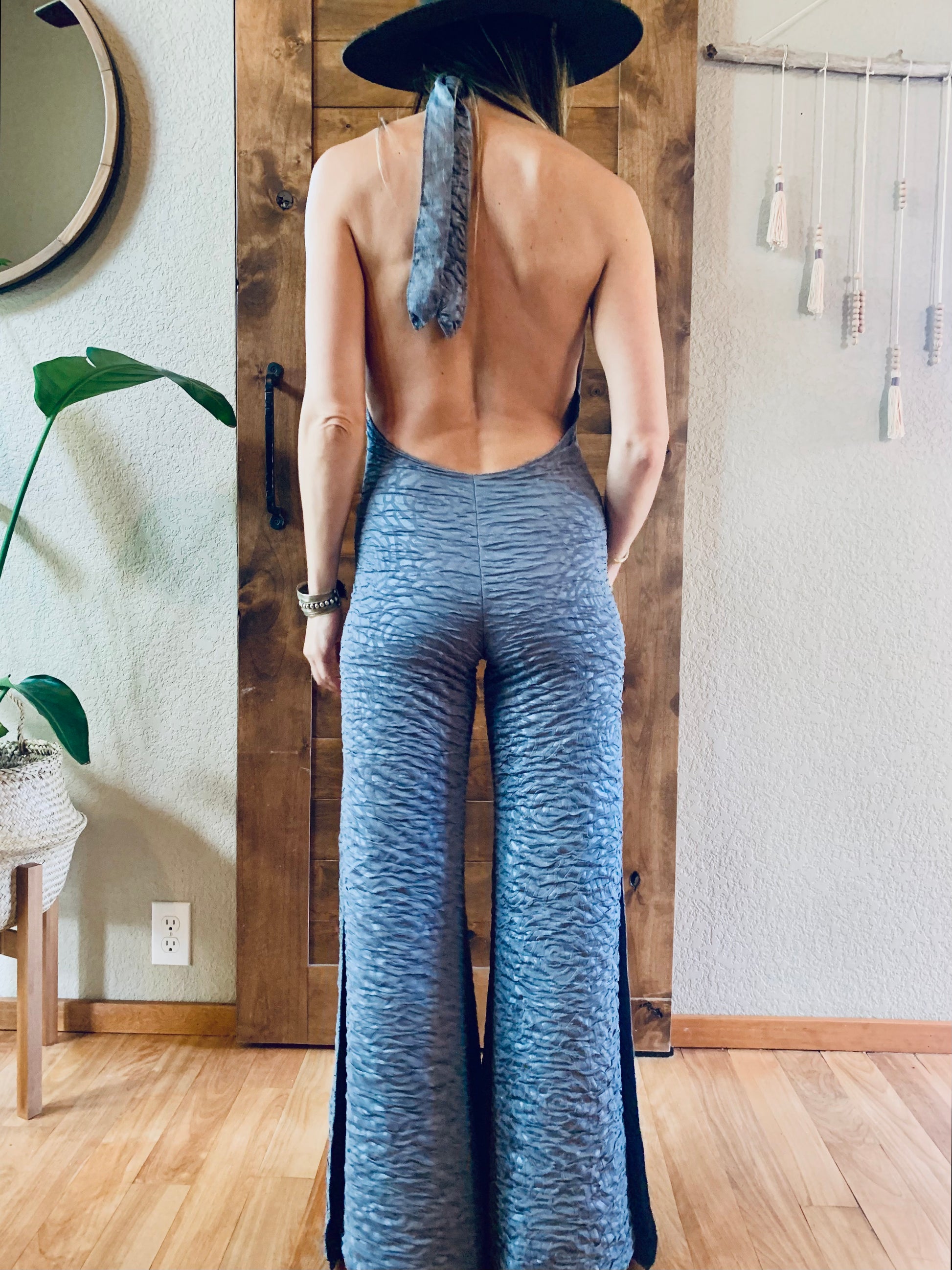 This stylish open back onesie is perfect for any occasion. Dress it up for a night out or pair it with a jacket and boots for a chic, casual look. You can adjust the fit with the easy tie-back around the neck, and the convenient side slit allows for easy bathroom breaks without needing to remove the entire outfit. Made from a four-way stretch fabric for ultimate comfort, this piece is a favorite on the dance floor and beyond.