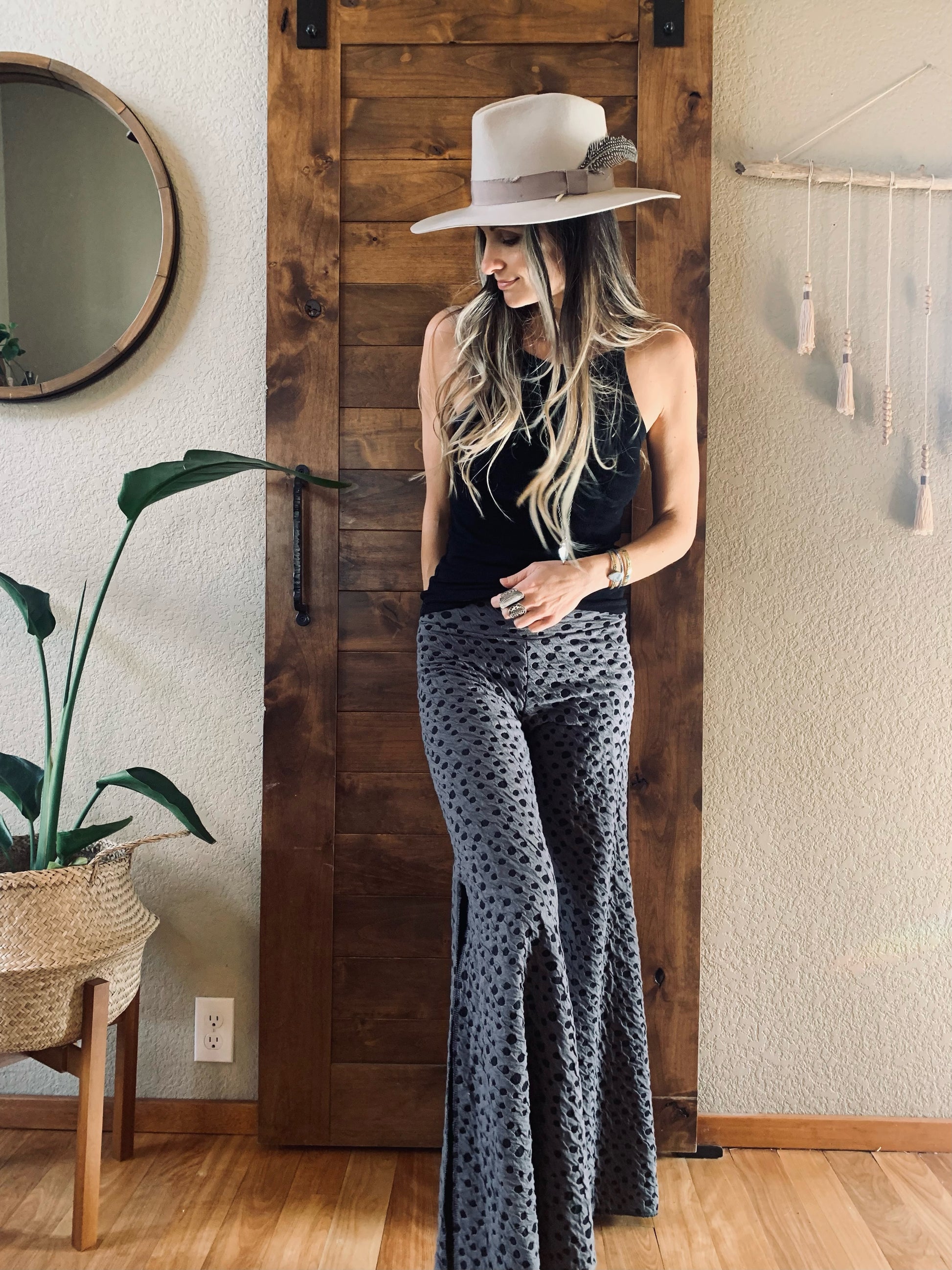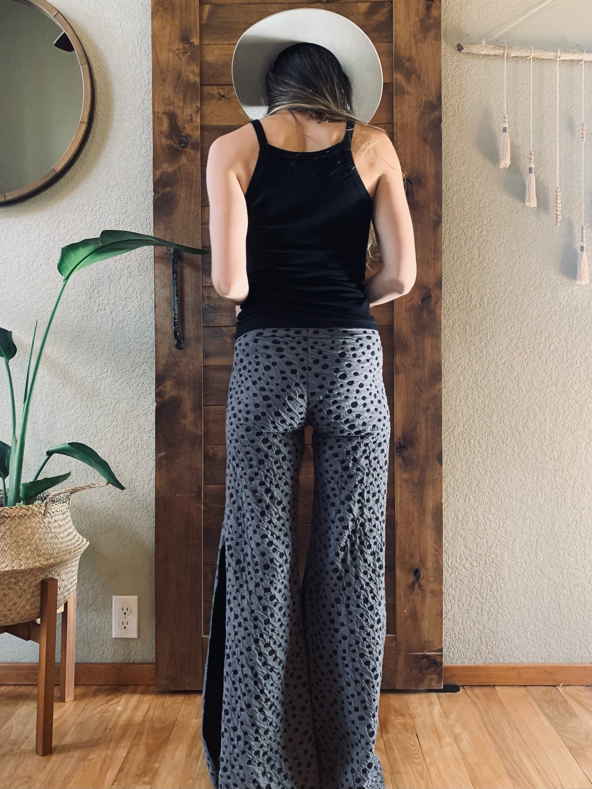Dance under the moon with these comfortable, flared, moon-rock patterned pants, featuring a daring slit on the side for extra movement. Pair with your favorite top for a casual night in or a fancy night out. You can't go wrong with these "out of this world" pants.