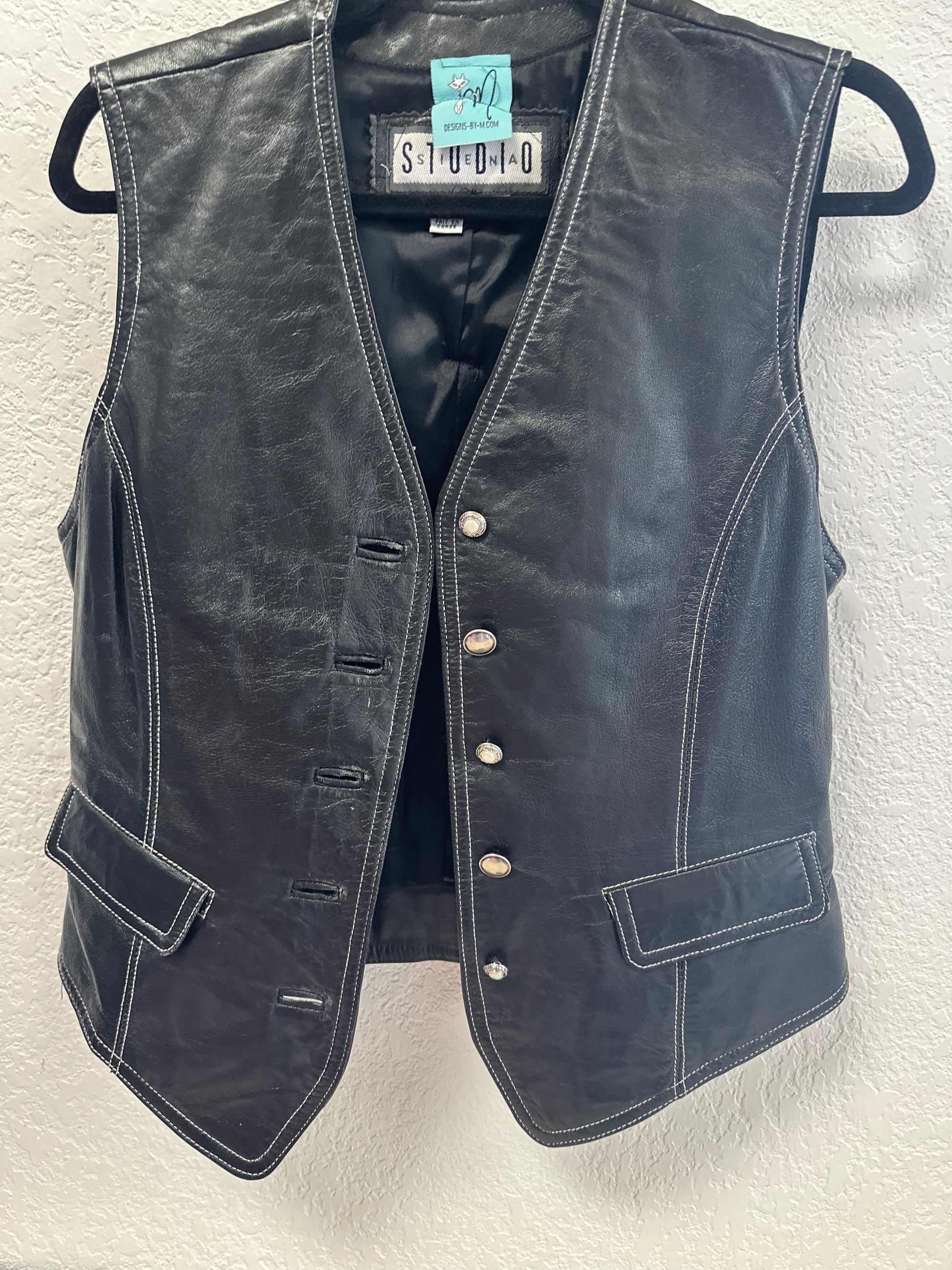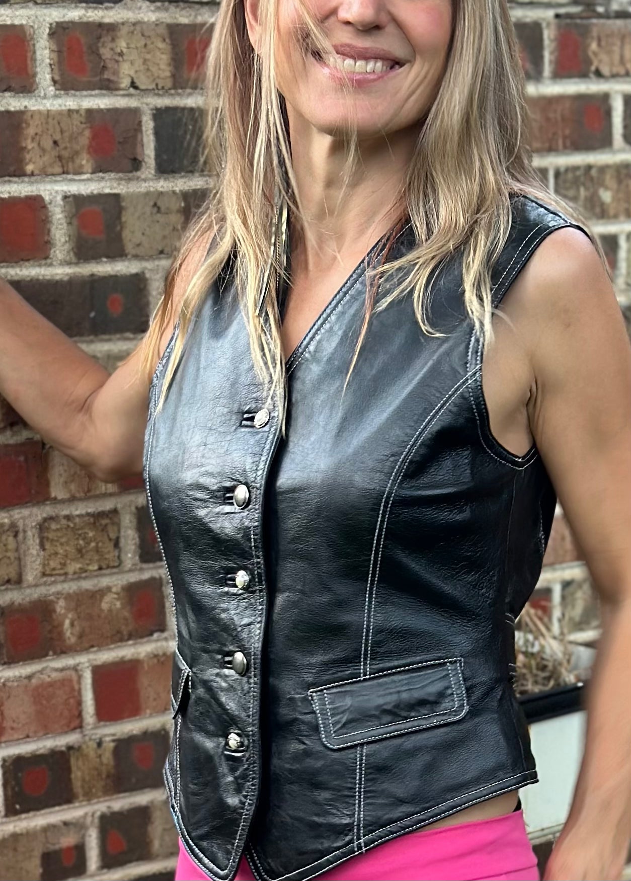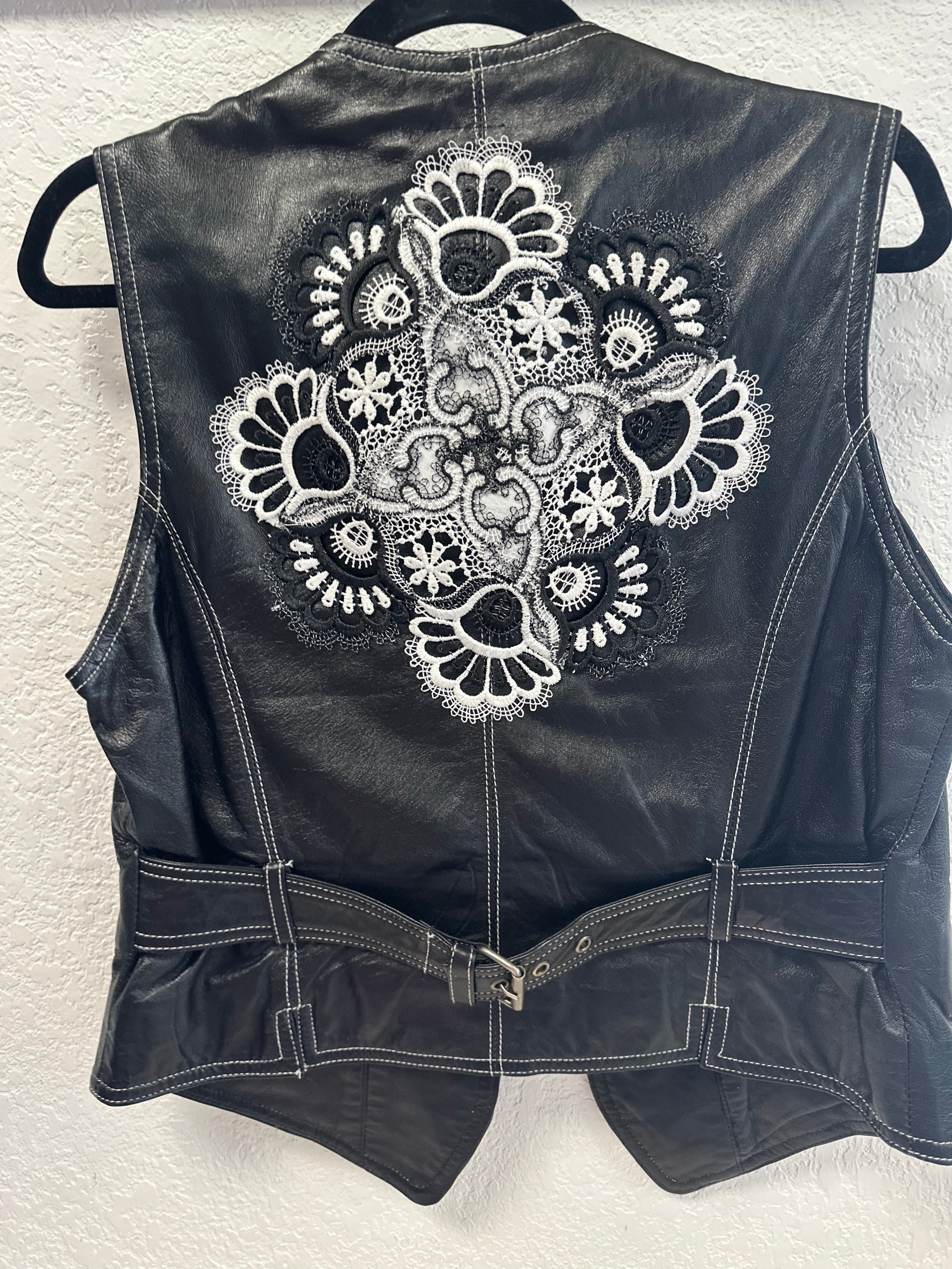 This leather vest has been up-cycled with a unique embroidered design on the back. Adjustable size with strap in back.