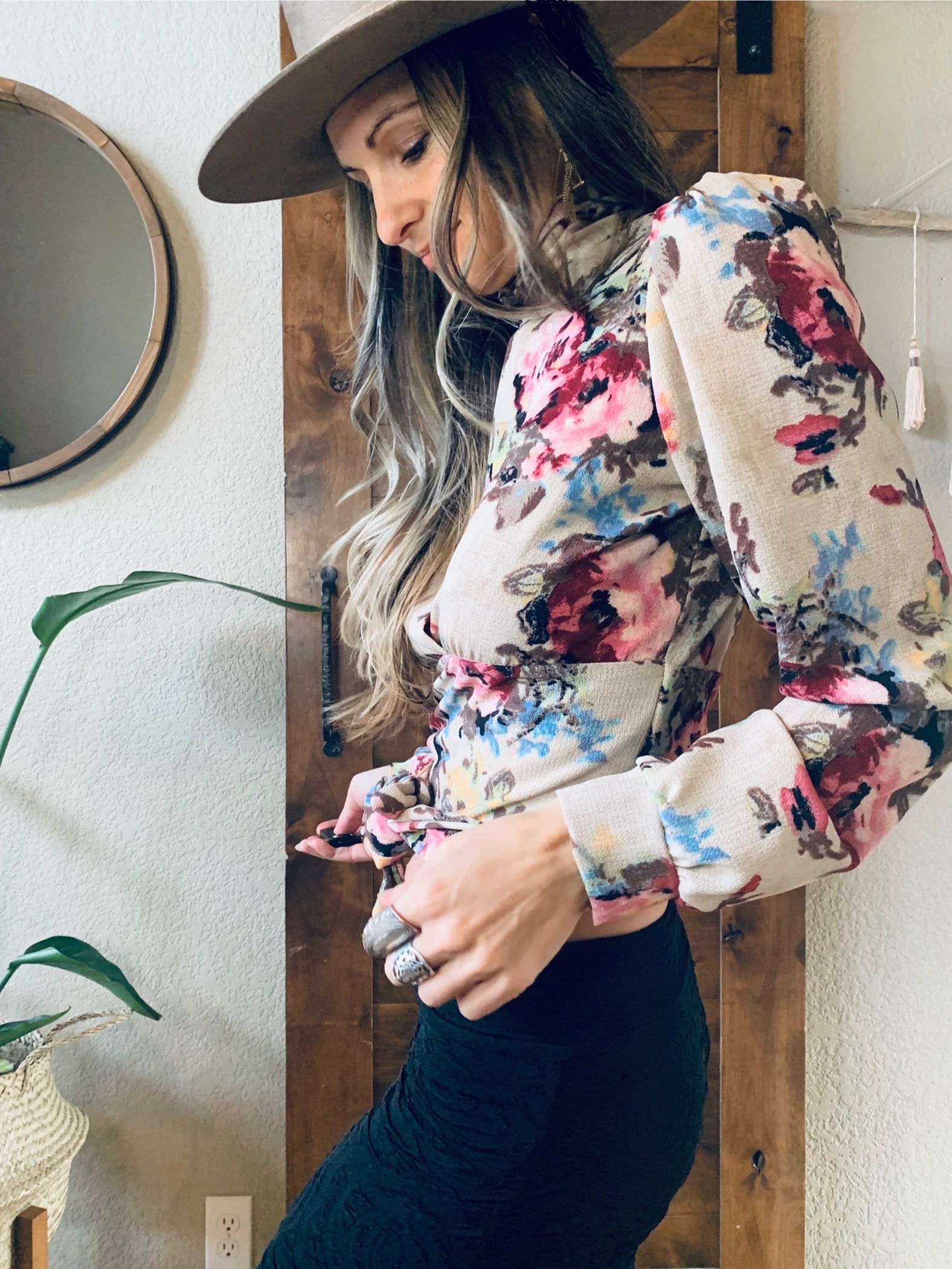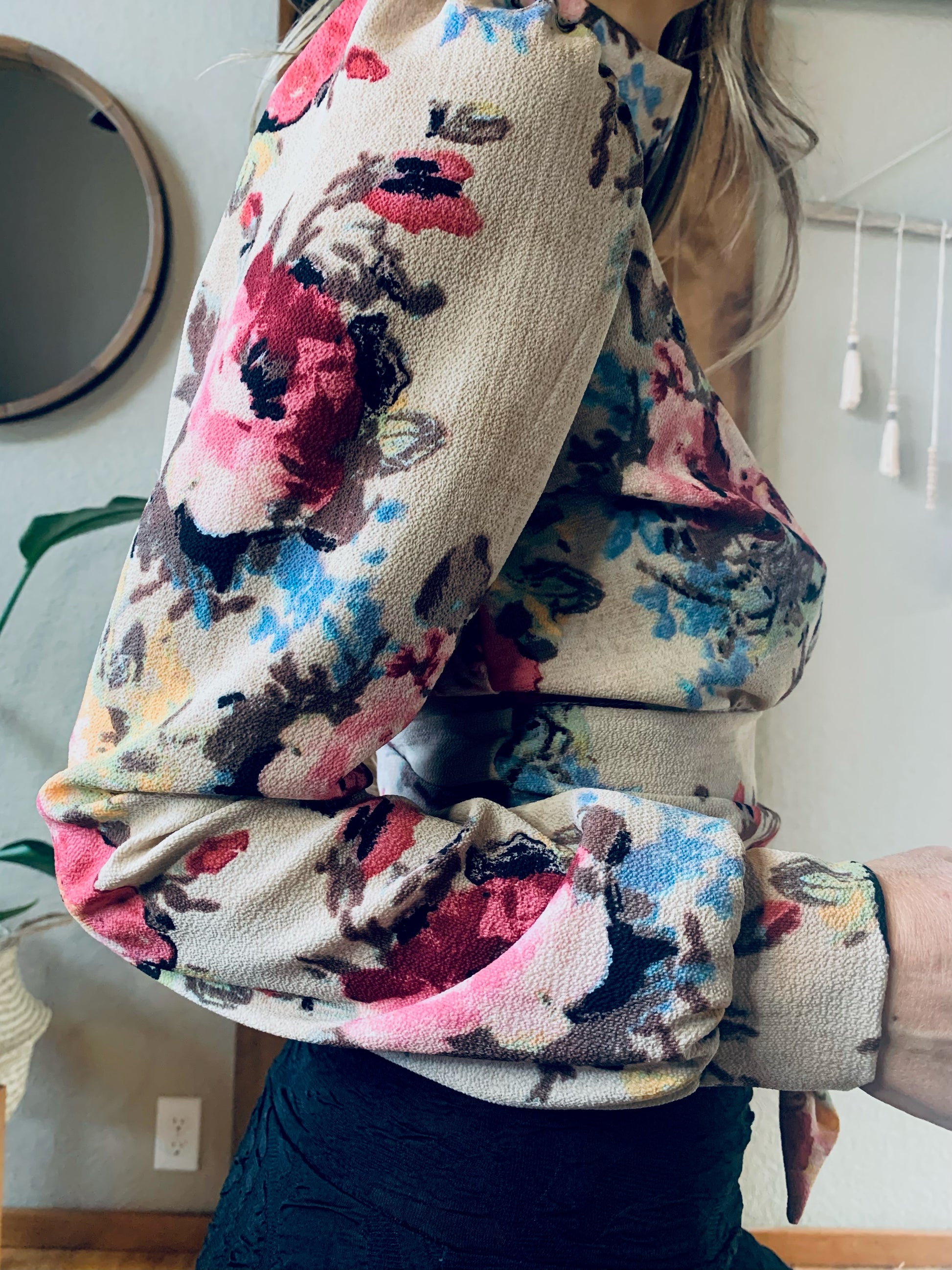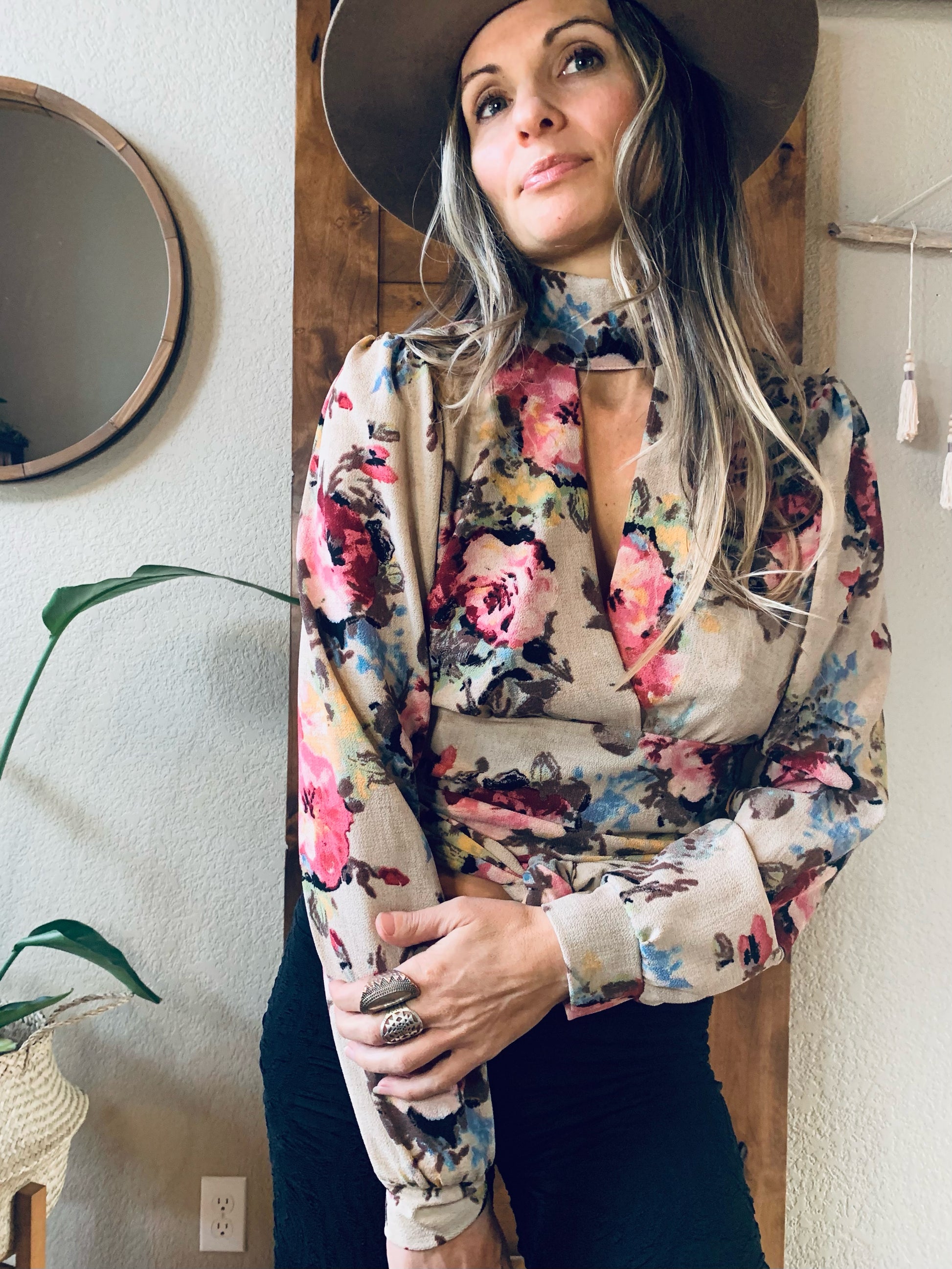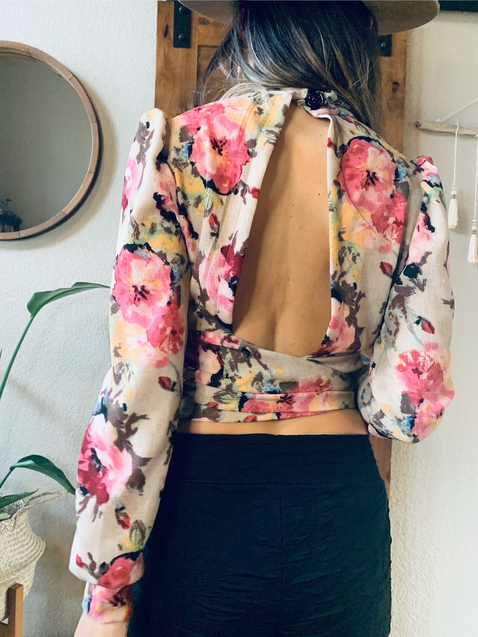 This long sleeved peek-a-boo blouse is both sweet and sexy. Featuring elegant backless design that ties at the lower back, slight puff sleeves, and a buttoned choker style neckline, this versatile piece is perfect for any occasion, weather it is high tea in the garden or a night out on the town. Wear it with jeans or a fancy skirt or pant to elevate your style.