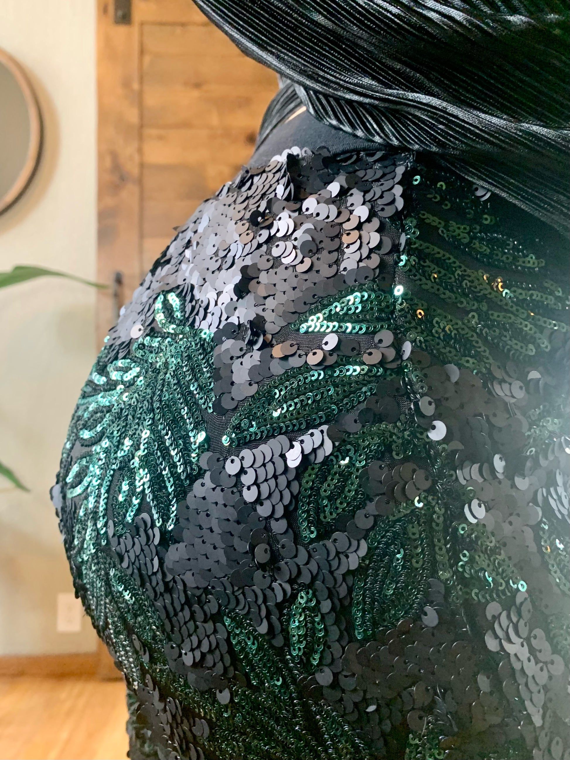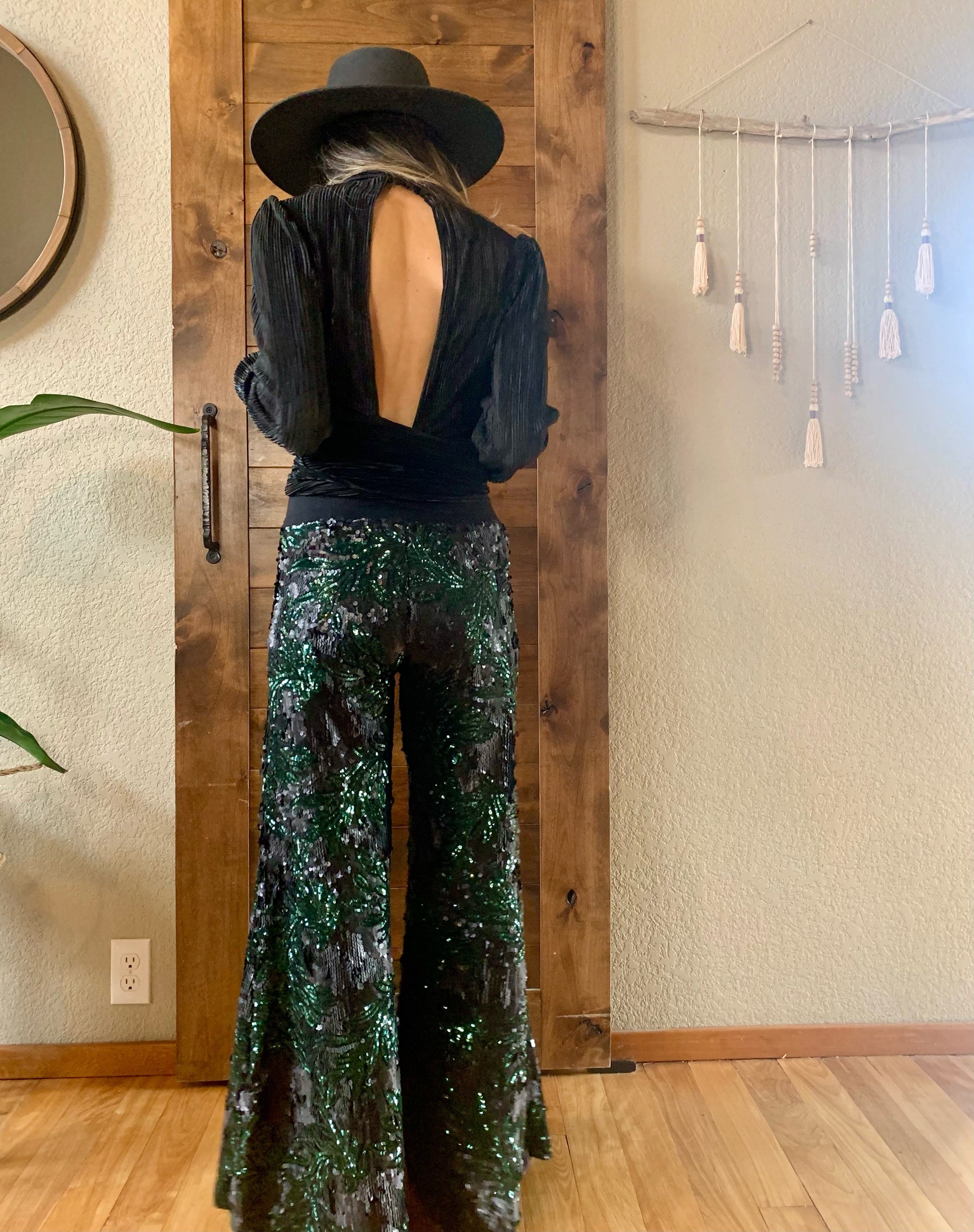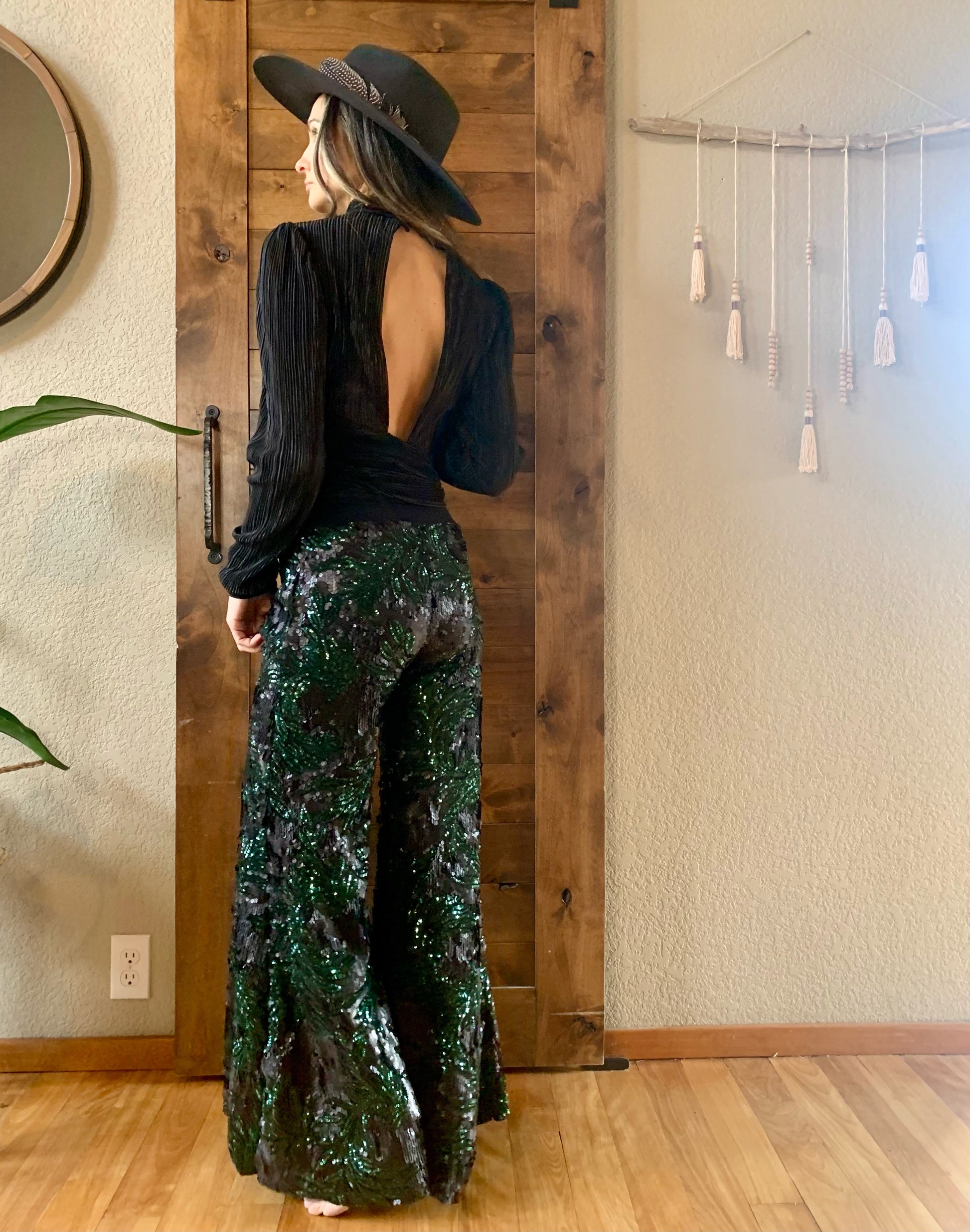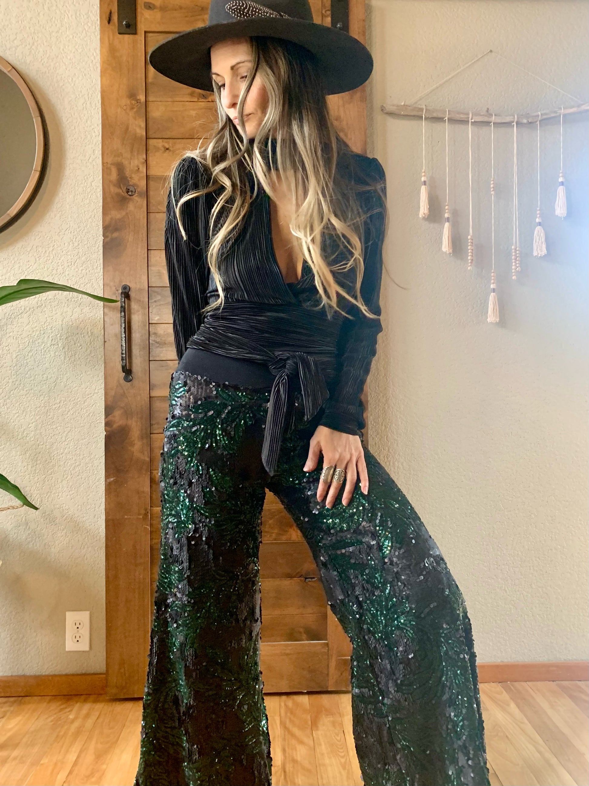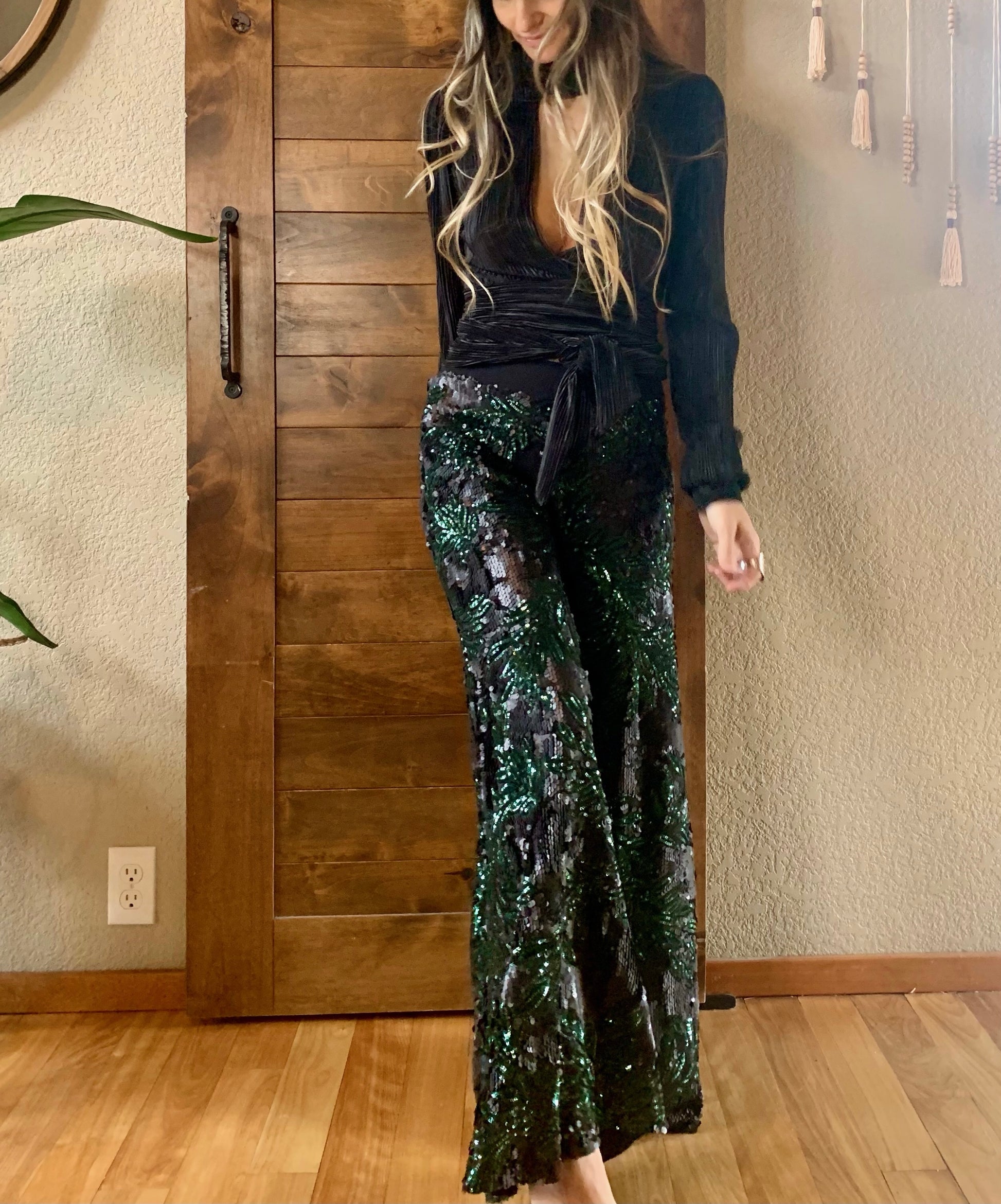 Be red carpet ready in these beautiful sequin pants. With green and black leaf design in lavish sequin and a flattering flare cut, you'll be the belle of the ball.
