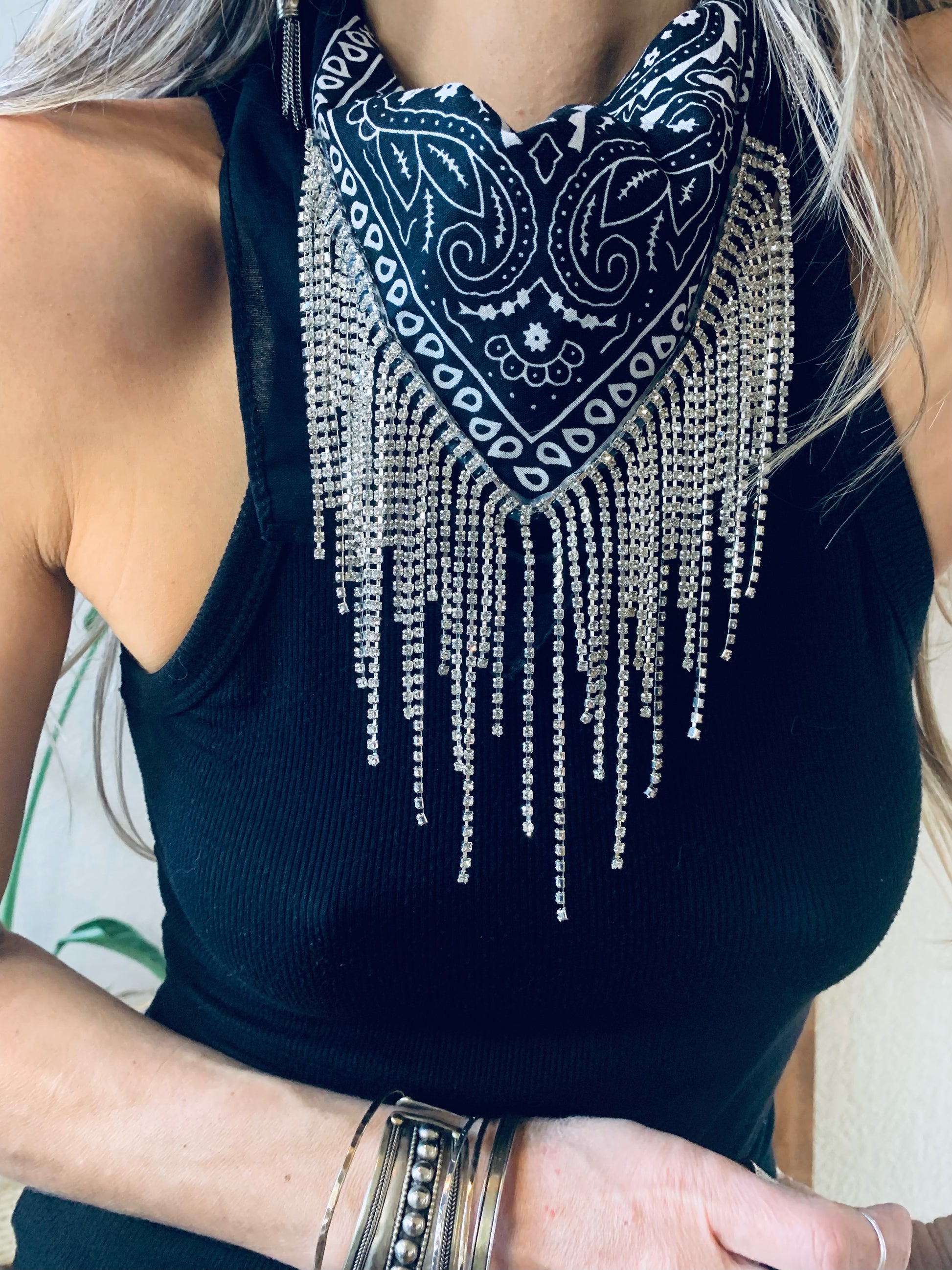 A fancy take on an old style. This neckerchief is adorned with a sparking rhinestone fringe and adds a glamorous touch to a functional garment.