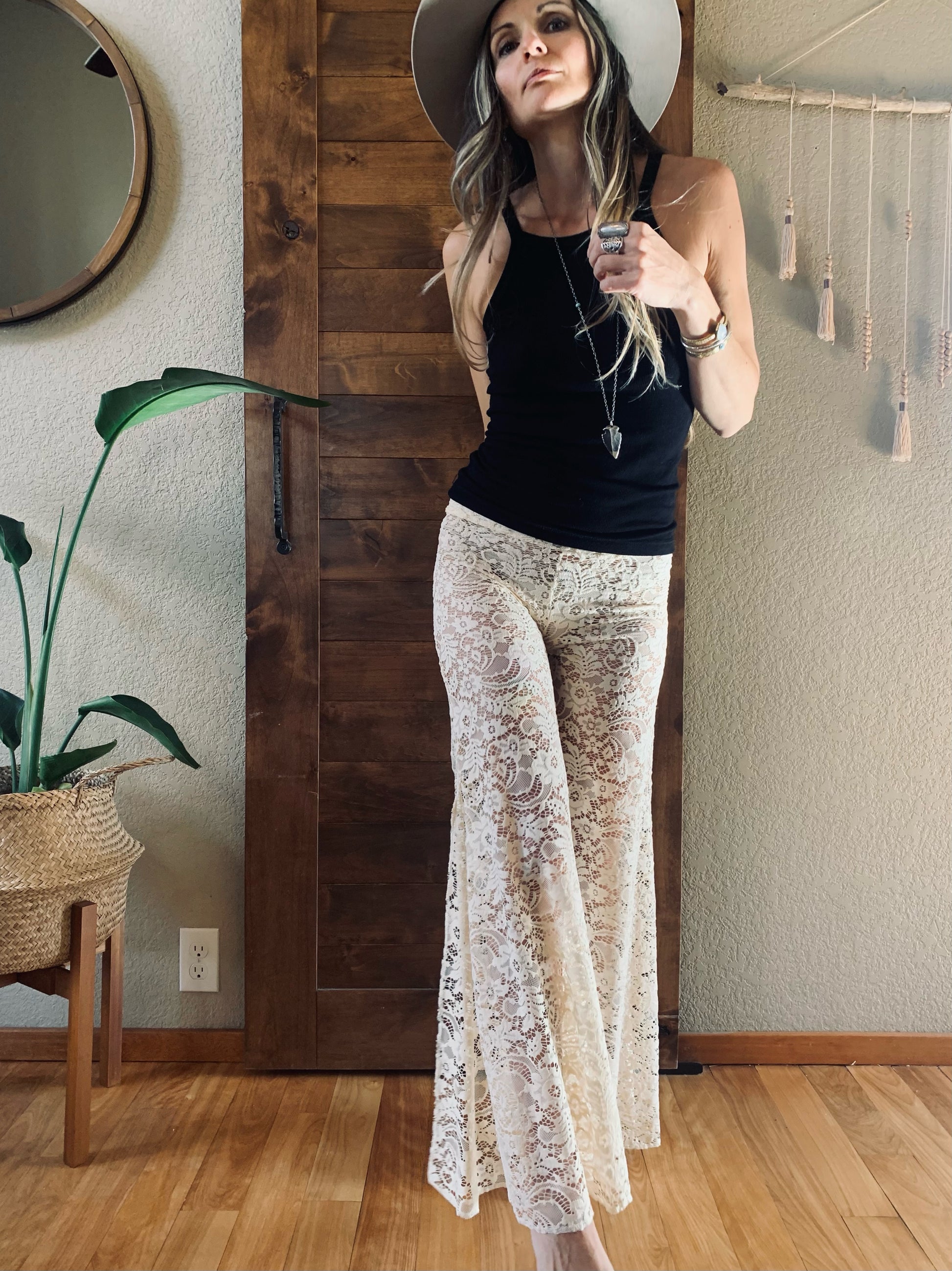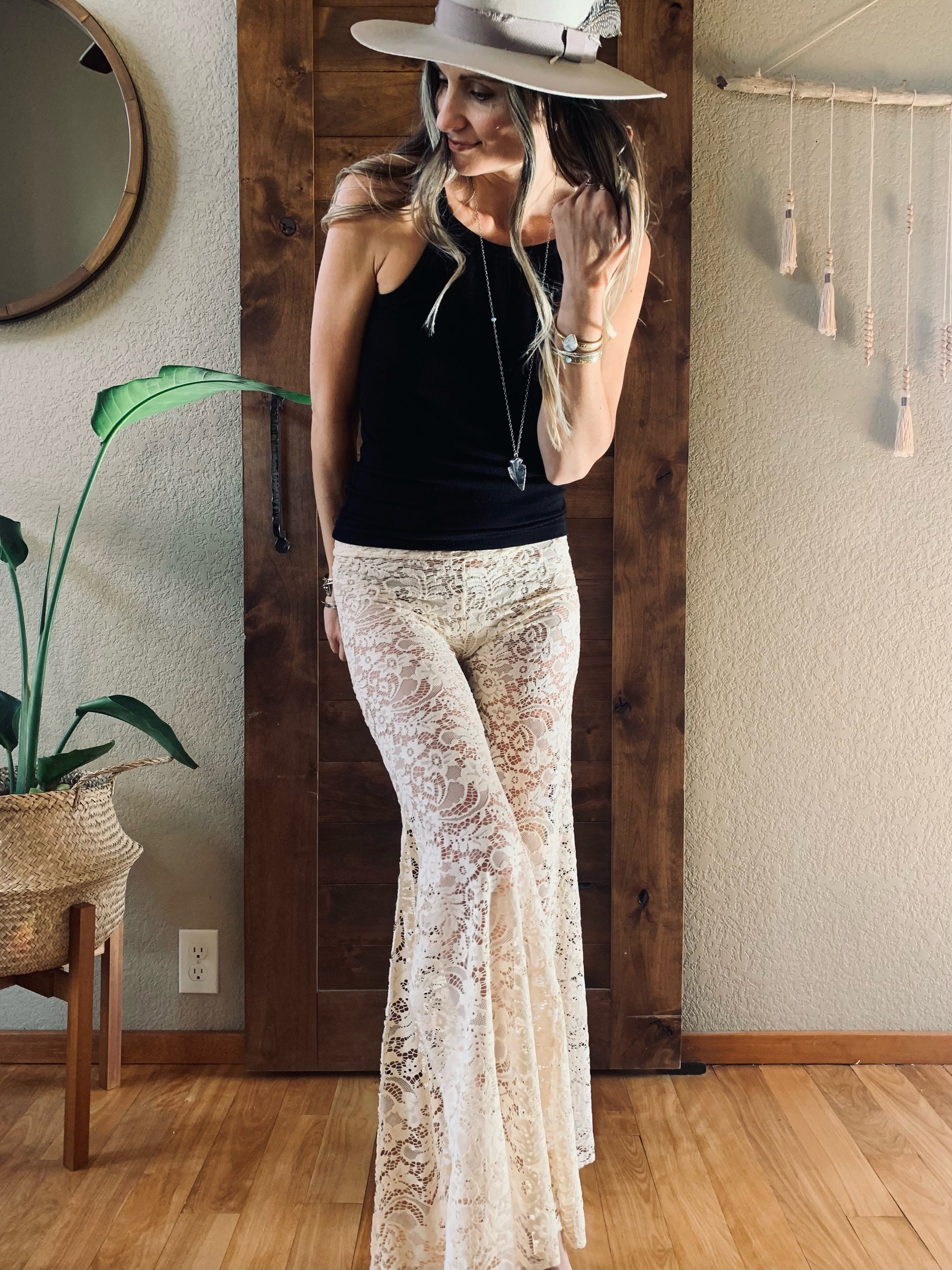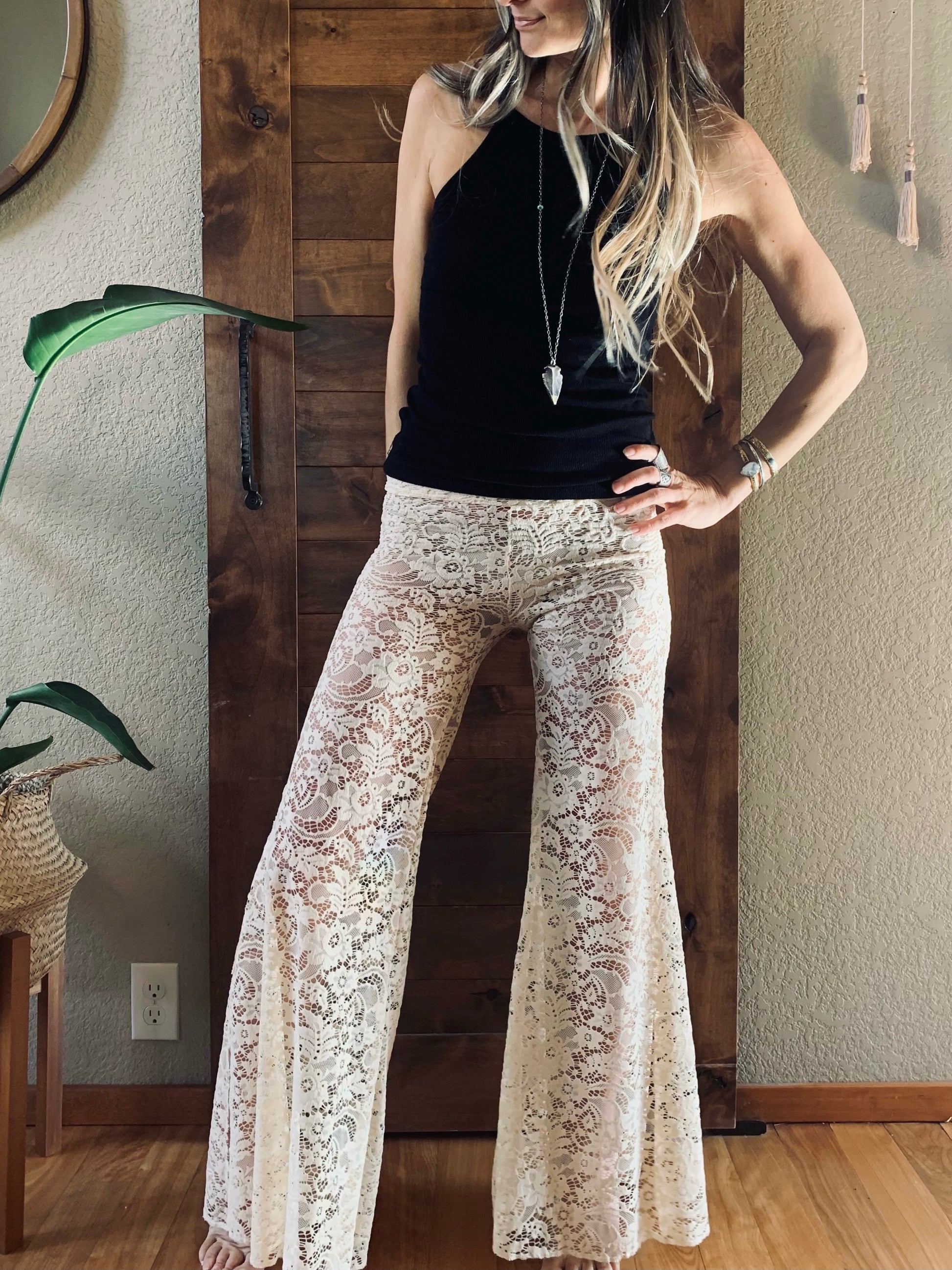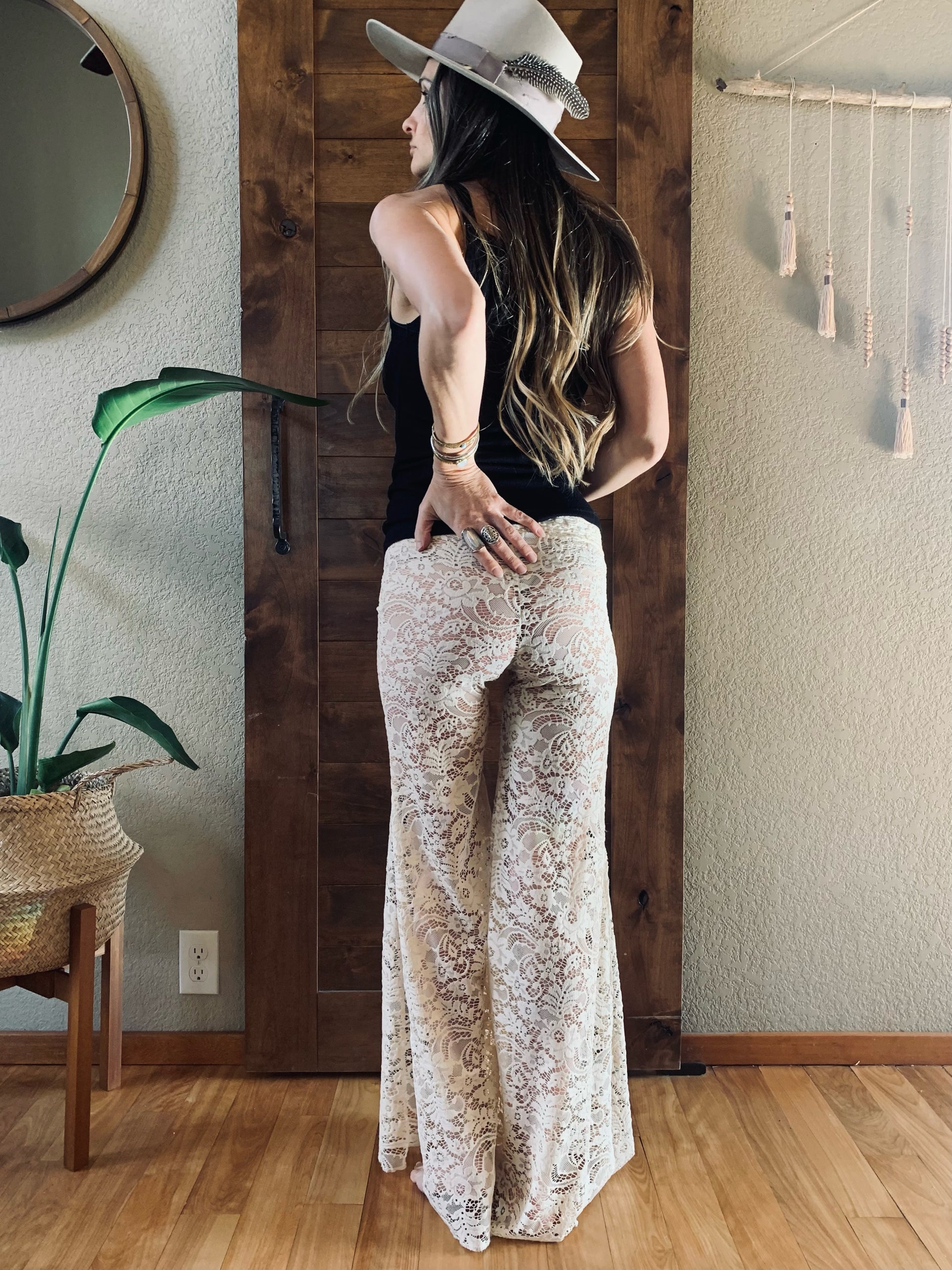 Dance the night away with these lightweight, sexy, flare lace pants in cream, featuring a generous leg slit for extra movement. With this sheer cream colored lace material, you can show off your favorite panties, layer with any color tights, or dare to go bare. A guaranteed favorite on a hot dance floor.